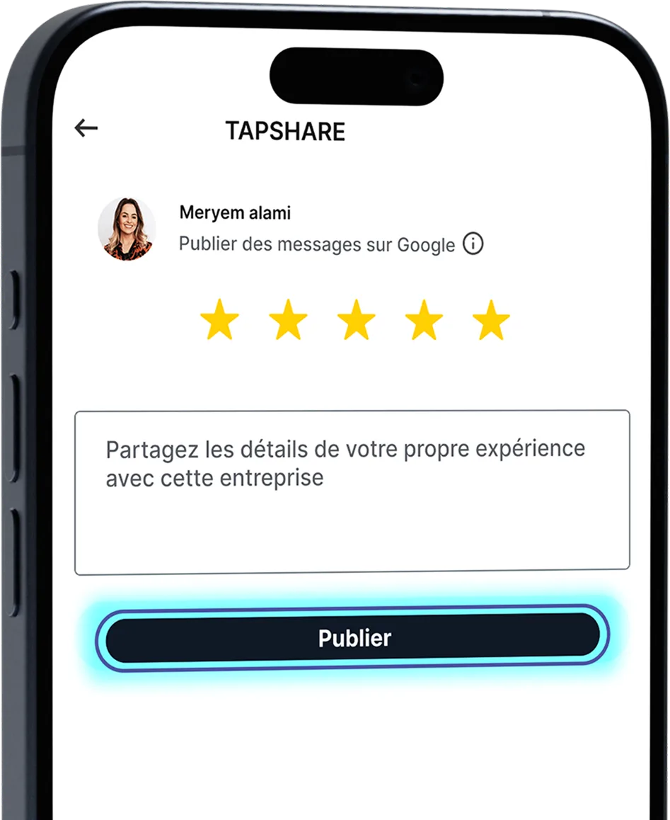 Ne laissez plus vos succès dans l’ombre ! Avec TAPSHARE Reviews, recueillez et affichez instantanément les avis de vos clients. Chaque échange via votre carte connectée devient une opportunité de renforcer votre crédibilité.